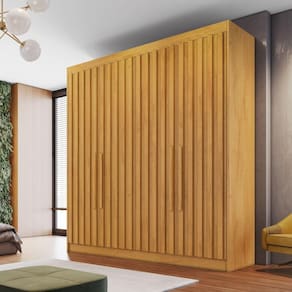 Guarda Roupa 4 Portas Potente 100% Mdf Móveis Europa Peróba O Guarda Roupa Potente - Moveis Europa une praticidade, espaco e elegancia em um so item. Seu design moderno e acentuado pelas portas ripadas de madeira, complementado por um acabamento em Verniz UV que proporciona uma escala de brilho semi-brilho e uma durabilidade excepcional. Fabricado em 100 MDF (Madeira de Reflorestamento), o roupeiro destaca-se pelas suas 4 portas elegantes com grandes puxadores em madeira e 3 gavetas internas, uma dessas gavetas possui chave, oferecendo seguranca adicional para seus itens mais preciosos e sao equipadas com puxadores modernos. O Guarda Roupa inclui ainda 1 sapateira com corredicas telescopicas, prateleiras espacosas e 2 cabideiros em aluminio, garantindo um excelente aproveitamento dos espacos internos e alta durabilidade. Para maior resistencia e durabilidade, o movel conta com costas parafusadas. Caracteristicas: Materiais: 100 MDF (Madeira de Reflorestamento) Acabamento: Verniz UV Escala de Brilho: Semi-Brilho Sistema de Montagem: Parafuso, Minifix e Cavilha Quantidade de Portas: 4 Quantidade de Gavetas: 3 Quantidade de Gavetas com Chave: 1 Quantidade de Prateleiras: 10 Quantidade de Sapateiras: 1 Quantidade de Cabideiros: 2 Corredicas: Telescopicas Puxadores externos: Madeira Material dos Cabideiros: Aluminio