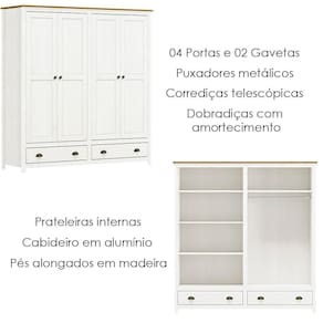 Guarda-Roupa projetado para quem busca aliar sofisticação e praticidade no seu espaço. Fabricado em madeira maciça, oferece durabilidade e resistência para o seu dia a dia. Com 176cm de largura, 04 portas e 02 gavetas, o modelo conta com amplo espaço interno, permitindo organização eficiente de suas roupas e acessórios. Seu design moderno se destaca pelos pés alongados em madeira, conferindo um toque de leveza ao móvel, e seu acabamento com pintura acetinada em verniz PU e UV que realça a beleza natural da madeira. As gavetas possuem corrediças telescópicas, garantindo um deslizamento suave e silencioso, e as portas são equipadas com dobradiças com amortecimento, oferecendo um fechamento sem impactos. Com 04 prateleiras internas e 01 cabideiro em alumínio, o guarda-roupa oferece organização ível e suficiente para todos os seus itens. Os puxadores metálicos no estilo concha e botão trazem um charme extra ao design, combinando perfeitamente com o restante da peça. Este móvel chegará em sua casa separado em 03 volumes.