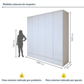 As gavetas ficam na parte interna e externa, organizando melhor os itens. Acabamento da Prateleira: Impressão Escala de Brilho da Prateleira: Semi-Brilho Acabamento da Gaveta: Impressão Escala de Brilho da Gaveta: Semi-Brilho Possui Organizador de Gaveta: Não Acabamento da Porta: Impressão Escala de Brilho da Porta: Semi-Brilho Ambiente Principal: Quarto codigo_ean: 7900288149800 Complexidade da Montagem: Média: pode ser montado por mais de uma pessoa e/ou necessite de maior conhecimento para montagem Cor: Branco Cor do Produto: Branco Escala de Brilho: Semi-Brilho Espessura da Estrutura (mm): 15 mm Espessura das Portas (mm): 15 mm Espessura das Prateleiras (mm): 15 mm Espessura do Fundo (mm): 3 mm Espessura do Fundo das Gavetas (mm): 3 mm Gaveta com Chave: Não Itens Inclusos: 1 Guarda Roupa, Manual de Montagem e Kit Ferragens. Linha ou Coleção: Urbano Manual de Montagem e Instalação: https://product-hub-prd.madeiramadeira.com.br/826006295/documents/e6b809f2-a293-44a3-ad0d-09227ffdc4ad11744799955449922839171072.pdf Marca: Josandro Material da Gaveta: MDF Material da Porta: MDF Material da Prateleira: MDF Material Principal: MDF modular: Não Necessita Montagem: Sim Nicho com Cabideiro: Não Origem do Produto: Nacional Peso: 215 kg Peso Máximo por Gaveta: 5 kg Peso Máximo por Prateleira: 10 kg Possui Calceiros: Não Possui Espelho: Não Possui Pés: Não Possui Portas: Sim Possui Prateleiras: Sim Produto Montado: Sim Quantidade de Cabideiros: 02 Cabideiros Quantidade de Gavetas: 06 Gavetas Quantidade de Prateleiras: 06 Prateleiras Recomendações de Uso, Manutenção e Limpeza: Utilizar pano macio levemente umedecido e na sequencia pano macio seco. Sistema de Montagem: Parafusos Tipo de Corrediça da Gaveta: Metálica Telescópica Tipo de Dobradiça/Corrediça da Porta: Metálica Tipo de Gaveta: Interna e Externa Tipo de Guarda-Roupa: Casal Tipo de Puxador da Gaveta: Embutido Tipo de Puxador da Porta: Embutido