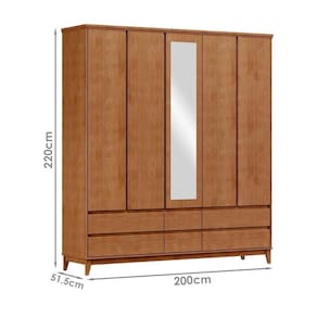 Guarda-roupa 5 Portas e 6 Gavetas com estrutura em MDF de 15mm (portas e gavetas em madeira maciça de pinus de reflorestamento), garantindo durabilidade e resistência, uma peça sofisticada e funcional, perfeita para manter tudo organizado com estilo. Pintura acetinada com verniz PU e UV, proporcionando beleza e proteção extra, possuindo 05 portas, sendo 01 central com espelho, equipadas com dobradiças com amortecimento, proporcionando fechamento sem impactos, além de 06 gavetas com corrediças telescópicas, permitindo abertura total e deslizamento suave e silencioso. Conta com 07 prateleiras internas e 01 cabideiro em alumínio, ideal para roupas e acessórios, puxadores cava e pés em madeira maciça, garantindo um toque refinado e elegante. Este móvel chegará em sua casa separado em 04 volumes.