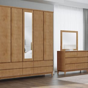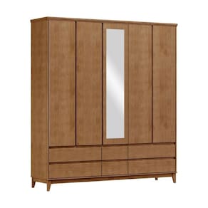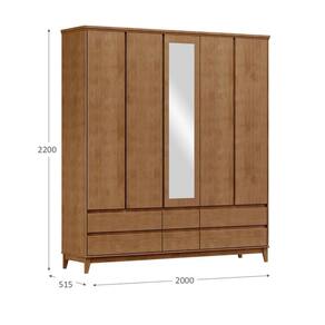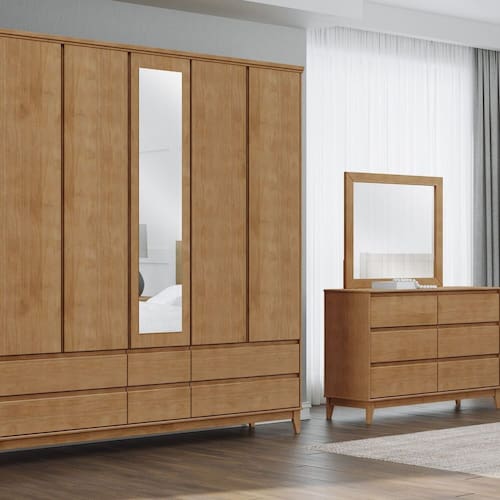 O Guarda Roupa 5 Portas 6 Gavetas da Linha Prata é feito de madeira maciça e MDF de 15 cm. Os pés, as portas e as frentes das gavetas, são em madeira maciça e a estrutura é de MDF. O acabamento é com pintura acetinada em verniz PU e UV.