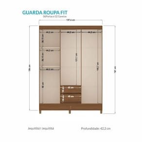 Possui pés em PVC, permitindo que o guarda-roupa fique elevado do chão, facilitando a limpeza embaixo dele. Acabamento da Prateleira: Pintura Escala de Brilho da Prateleira: Semi-Brilho Possui Cabideiros: Sim Acabamento da Gaveta: Pintura Escala de Brilho da Gaveta: Semi-Brilho Possui Organizador de Gaveta: Não Acabamento da Porta: Pintura Escala de Brilho da Porta: Semi-Brilho Material do Puxador da Porta: PVC Acabamento dos Pés: Pintura Altura dos Pés: 5 cm Altura Máxima dos Pés: 5.0000 Ambiente Principal: Quarto codigo_ean: 7909903613511 Complexidade da Montagem: Média: pode ser montado por mais de uma pessoa e/ou necessite de maior conhecimento para montagem Cor: Jequitiba Cor do Produto: Jequitibá Cor Flex: Não Cor Interna: Jequitibá Escala de Brilho: Semi-Brilho Gaveta com Chave: Não Itens Inclusos: Guarda Roupa, pés, acessórios e manual de montagem Linha ou Coleção: Fit Manual de Especificação Técnica: https://product-hub-prd.madeiramadeira.com.br/898253/documents/1f75ec61-5524-4100-a3f1-7ee4e47ea65a1847376946017grfit62.pdf Manual de Montagem e Instalação: https://product-hub-prd.madeiramadeira.com.br/898253/documents/bc4cbb1c-6981-448b-b817-ba24fd2983681847375946017grfit621.pdf Material da Gaveta: MDP Material da Porta: MDP Material da Prateleira: MDP Material dos Pés: PVC Material Principal: MDP modular: Não Montagem Flex: Não Necessita Montagem: Sim Origem do Produto: Nacional Peso: 60,45 kg Peso Máximo por Gaveta: 3 kg Peso Máximo por Prateleira: 3 kg Possui Calceiros: 01 Possui Espaço para Vestidos Longos: Sim Possui Espelho: Não Possui Espelho Interno: Não Possui Ganchos: Não Possui iluminação: Não Possui Nichos: Não Possui Painel de TV: Não Possui Pés: 06 Possui Portas: Sim Possui Prateleiras: Sim Possui Sapateira: Não Produto Montado: Sim Quantidade de Gavetas: 02 Gavetas Quantidade de Prateleiras: 02 Prateleiras Recomendações de Uso, Manutenção e Limpeza: Não limpar com álcool ou qualquer outro produto químico, utilize somente pano seco ou levemente umedecido. Sapatas Niveladoras: Não Sistema de Montagem: Parafusos e cavilhas Tipo de Corrediça da Gaveta: Metálica Simples Tipo de Dobradiça/Corrediça da Porta: Metálica Tipo de Gaveta: Externa Tipo de Guarda-Roupa: Casal Tipo de Puxador da Gaveta: Não Possui Tipo de Puxador da Porta: Externo