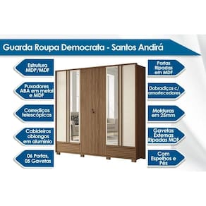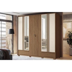 Tipo de Cabideiro - Aéreo Material dos Cabideiros - Cabideira Metálico Tipo de Porta do Guarda-Roupa - Portas de Bater Material das Portas - Portas em MDP Tipo de Dobradiças - Dobradiças Metálicas Diferenciais das Portas - Portas Ripadas - Porta c/ Espelho Quantidade de Portas - 6 Portas de Abrir Quantidade de Portas com Espelho - 2 Portas com Espelho Tipo de Espelho - Espelho Externo Quantidade de Espelhos - 4 Espelhos Material das Gavetas - Gavetas em MDP Tipo de Corrediça - c/ Corrediças Telescópicas Quantidade de Gavetas - 5 Material de Estrutura Fundo Gaveta - Em HDF Tipo dos Pés - Pés de Madeira Quantidade de Pés - 8 pés Material das Prateleiras - Prateleiras em MDP Quantidade de Prateleiras - 5 Quantidade de Nichos - 1 Nicho