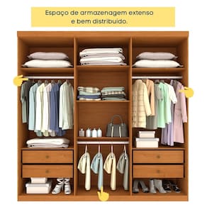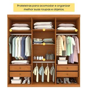 Guarda Roupa 6 Portas 219cm Lima Espresso Móveis produto em MDP com 6 portas com 3 dobradiças de 26cm por porta e puxadores em MDF que exibem um design moderno, com uma pega prática, tornando o ambiente ainda mais elegante, 2 cabideiros e 1 calceiro em alumínio, 4 gavetas com puxadores e corrediças telescópicas, fornecendo maior praticidade e segurança ao produto, possibilitando um deslizamento suave, firme e silencioso, prateleiras para acomodar e organizar melhor suas roupas e objetos. Espaço de armazenagem extenso e bem distribuído.