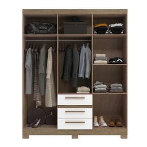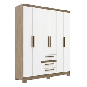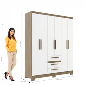 Dimensões: 200,5x162,6x45cm(AxLxP) | Altura: 200,5 cm | Largura: 162,6 cm | Profundidade: 45 cm | Peso: 88,95 kg | Acabamento: Pintura UV | Cor Interna: Nogal | Tipo de porta: Bater | Altura dos pés: 10 cm | Material dos pés: Polipropileno | Tipo de dobradiça: Metálica | Tipo de corrediça: Metálica | Manutenção e limpeza: Utilize pano umedecido com água | Complexidade da montagem: Média: pode ser montado por mais de uma pessoa e|ou necessite de maior conhecimento para montagem | Material: MDP frentes 15mm caixas 12mm | Quantidade de pés: 6 pés | Quantidade de portas: 6 portas | quantidade de gavetas: 3 gavetas | Material do puxador: MDP | Conteúdo da embalagem: 1 guarda-roupa, kit ferragens e manual de montagem Cor: Wood|Branco