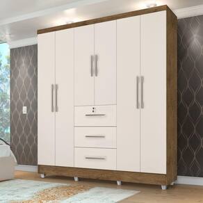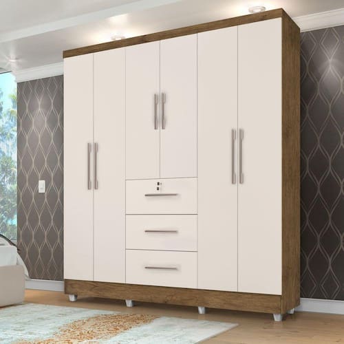 O Roupeiro Tókio 6 portas, possui 4 prateleiras, 2 espelhos externos, 3 cabideiro e 3 gavetas externas, sendo uma com chave. O modelo transimite conforto e beleza ao ambiênte. Possui pintura UV, com verniz brilhante, que alta resistência e durabilidade ao produto. Acabamento da Prateleira: Verniz Escala de Brilho da Prateleira: Brilhante Possui Cabideiros: 03 Acabamento da Gaveta: Verniz Possui Organizador de Gaveta: Não Acabamento da Porta: Verniz Escala de Brilho da Porta: Fosco Altura dos Pés: 7 cm Ambiente Principal: Quarto Complexidade da Montagem: Alta: deve ser montado por um montador especializado Cor: Jequitibá/Off White Cor do Produto: Jequitiba/Off White Escala de Brilho: Fosco Gaveta com Chave: Sim Itens Inclusos: 1 Guarda Roupas, Kit Ferragens e Manual de Montagem Linha ou Coleção: Tokio Manual de Montagem e Instalação: https://cdn2.madeiramadeira.com.br/atributo/j-a-m-veis/888871-roupeiro-joara-6-pts.pdf Material da Gaveta: MDP Material da Porta: MDP Material da Prateleira: MDP Material dos Pés: Plástico Material Principal: MDP Necessita Montagem: Sim Origem do Produto: Nacional Peso: 89,11 kg Peso Máximo por Gaveta: 15 kg Possui Calceiros: Não Possui Espelho: Não Possui Pés: 08 Possui Portas: 06 Possui Prateleiras: 04 Recomendações de Uso, Manutenção e Limpeza: Limpar com pano seco, manter em lugar livre de umidade, ao abrigo de exposição direta ao sol. Sapatas Niveladoras: Não Sistema de Montagem: Parafusos, Tampas, pregos Tipo de Corrediça da Gaveta: Metálica Simples Tipo de Dobradiça/Corrediça da Porta: Metálica Tipo de Gaveta: Interna Tipo de Guarda-Roupa: Casal Tipo de Puxador da Gaveta: Externo Tipo de Puxador da Porta: Externo