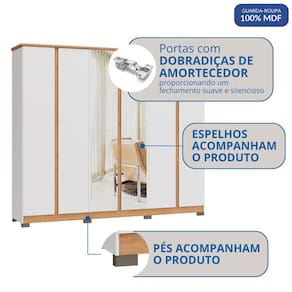 Guarda-Roupa 6 portas Zeus 100% MDF com espelho, com acabamento sofisticado e portas com ângulo de 45º, que trazem um visual moderno e maior resistência. Suas dobradiças com amortecedor garantem um fechamento suave, enquanto as corrediças telescópicas de extração total facilitam o acesso e a organização. O amplo espaço interno, com divisão ele e ela, atende às necessidades de todos, oferecendo praticidade e estilo para seu ambiente. Ideal para quem busca qualidade e funcionalidade. Acabamento da Prateleira: Pintura UV Escala de Brilho da Prateleira: Semi-Fosco Acabamento da Gaveta: Pintura UV Possui Organizador de Gaveta: Não Acabamento da Porta: Pintura UV Escala de Brilho da Porta: Semi-Fosco Altura do Espelho: 108,3 cm Altura dos Pés: 5 cm Altura Máxima dos Pés: 5.0000 Ambiente Principal: Quarto codigo_ean: 7900288105837 Complexidade da Montagem: Média: pode ser montado por mais de uma pessoa e/ou necessite de maior conhecimento para montagem Cor: Branco Line Cor do Produto: Branco Line Cor Interna: Branco Line Escala de Brilho: Semi-Fosco Espessura da Estrutura (mm): 15 mm Espessura das Portas (mm): 15 mm Espessura das Prateleiras (mm): 15 mm Espessura do Espelho: 3 mm Espessura do Fundo (mm): 3 mm Espessura do Fundo das Gavetas (mm): 3 mm Formato do Espelho: Retangular Itens Inclusos: 1 Guarda Roupa + 1 Manual de Montagem + 1 Kit Ferragens Largura do Espelho: 38,2 cm Linha ou Coleção: Quarto Manual de Montagem e Instalação: https://product-hub-prd.madeiramadeira.com.br/980496/documents/cdd9a1fe-d0a0-4935-8adb-5dfa0b1b2eee27348855314174161066844.pdf Marca: Móveis Castro Material da Gaveta: MDF Material da Porta: MDF Material da Prateleira: MDF Material dos Pés: Plástico Material Principal: MDF modular: Não Necessita Montagem: Sim Origem do Produto: Nacional Peso: 244,25 kg Peso Máximo por Gaveta: 4 kg Peso Máximo por Prateleira: 8 kg Possui Calceiros: Não Possui Espelho: Sim Possui Pés: 08 Possui Portas: Sim Possui Prateleiras: Sim Produto Montado: Sim Quantidade de Cabideiros: 02 Cabideiros Quantidade de Espelho: 04 Espelhos com Tamanhos Iguais Quantidade de Portas com Espelhos: 2 Portas com Espelho Recomendações de Uso, Manutenção e Limpeza: Limpar com pano levemente umedecido Sistema de Montagem: Parafus/Minifix/Cavilha. Tipo de Corrediça da Gaveta: Metálica Telescópica Tipo de Dobradiça/Corrediça da Porta: Aço Tipo de Fixação do Espelho: Fita Dupla Face Tipo de Gaveta: Interna Tipo de Guarda-Roupa: Casal Tipo de Puxador da Gaveta: Não Possui Tipo de Puxador da Porta: Embutido