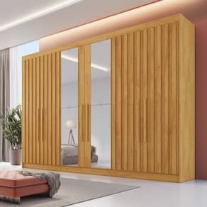 O Guarda Roupa 6 Portas 4 Portas Ripadas Potente com Espelho MDF - Móveis Europaune praticidade, espaço e elegância em um só item. Seu design moderno é acentuado pelas portas ripadas de madeira e pelo espelho integrado, complementado por um acabamento em Verniz UV que proporciona uma escala de brilho semi-brilho e uma durabilidade excepcional. Fabricado em 100% MDF (Madeira de Reflorestamento), o Guarda Roupa destaca-se pelas suas 6 portas elegantes com grandes puxadores em madeira e 6 gavetas internas, uma dessas gavetas possuem chave, oferecendo segurança adicional para seus itens mais preciosos e são equipadas com puxadores modernos. O roupeiro inclui ainda 2 sapateiras com corrediças telescópicas, prateleiras espaçosas e cabideiros em alumínio, garantindo um excelente aproveitamento dos espaços internos e alta durabilidade. Para maior resistência e durabilidade, o móvel conta com costas parafusadas.