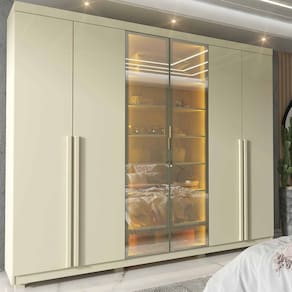 Um roupeiro moderno e imponente. Com quatro gavetas de corrediças telescópicas, portas em vidro Reflecta e puxadores metálicos que resultam em uma aparência elegante. Ampla quantidade de prateleiras e sapateira inclinada para facilitar a rotina e otimizar espaços. Pés inclusos.