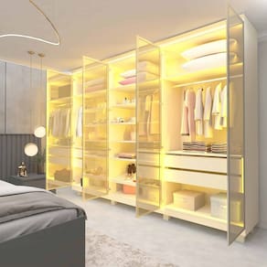 Um roupeiro moderno e imponente. Com quatro gavetas de corrediças telescópicas, portas em vidro Reflecta e puxadores metálicos que resultam em uma aparência elegante. Ampla quantidade de prateleiras e sapateira inclinada para facilitar a rotina e otimizar espaços. Pés inclusos.