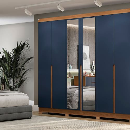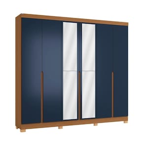 Renove seu quarto com o Roupeiro CB01R582 da Kappesberg. Com seis portas e quatro gavetas, são 2,23m de altura, 2,42m de largura e 47cm de profundidade, produzido 100% em MDF de 15mm, o que garante mais robustez e qualidade. Com sete camadas de pintura, a caixaria é na cor canela, com acabamento touch, e as portas, são na cor azul profundo, uma combinação linda e moderna ao espaço, e seus puxadores cava completam o estilo do produto. Na parte interna, ele possui nichos de tamanhos diferentes, cabideiros metálicos e com suporte interno, e gavetas com corrediças telescópicas, permitindo que você ocupe melhor o espaço. O destaque fsão os espelho nas portas centrais e o sistema de amortecimento nas portas, com um fechamento suave e sem ruídos. E para completar, ele possui pés em polipropileno.