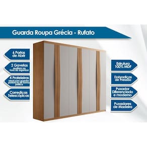 Material do Calceiro - Calceiro Metálico Tipo de Cabideiro - Aéreo Material dos Cabideiros - Cabideira Metálico Tipo de Porta do Guarda-Roupa - Portas de Bater Material das Portas - Portas em MDF Tipo de Dobradiças - Dobradiças Metálicas - Dobradiça de Pressão Quantidade de Portas - 6 Portas de Abrir Material das Gavetas - Gavetas em MDF Tipo de Corrediça - c/ Corrediças Telescópicas Quantidade de Gavetas - 2 Gavetas Material das Prateleiras - Prateleiras em MDF Quantidade de Prateleiras - 5