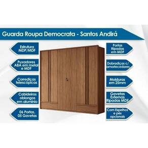 Tipo de Cabideiro - Aéreo Material dos Cabideiros - Cabideira Metálico Tipo de Porta do Guarda-Roupa - Portas de Bater Material das Portas - Portas em MDP Tipo de Dobradiças - Dobradiças Metálicas Diferenciais das Portas - Portas Ripadas Quantidade de Portas - 6 Portas de Abrir Material das Gavetas - Gavetas em MDP Tipo de Corrediça - c/ Corrediças Telescópicas Quantidade de Gavetas - 5 Material de Estrutura Fundo Gaveta - Em HDF Material das Prateleiras - Prateleiras em MDP Quantidade de Prateleiras - 5 Quantidade de Nichos - 1 Nicho