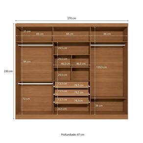 Aposte no Roupeiro T580 da Kappesberg. Com seis portas e três gavetas, são 2,30m de altura, 2,70m de largura e 47cm de profundidade, 100% em MDP, para mais organização e durabilidade. Com corpo em pintura touch na cor canela, com a textura dos veios da madeira, as portas são na cor grafite e acabamento fosco. Os puxadores alongados completam o charme do produto. Perfeito para quem gosta de espaço, nos nichos de tamanhos diferentes você organiza calçados e roupas dobradas nas prateleiras. Os cabideiros, metálicos e com suporte interno, são ideais para peças maiores, como casacos e vestidos. Já as gavetas, com corrediças telescópicas, permitem a abertura total e um melhor aproveitamento de espaço. O destaque é o sistema de amortecimento nas portas, para um fechamento suave e sem ruídos.