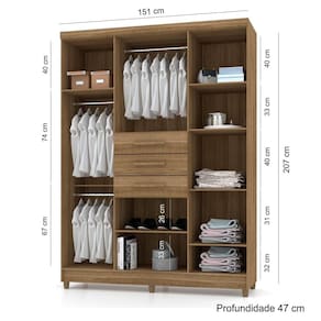 Corrediças Metalicas Acabamento da Prateleira: Pintura UV Escala de Brilho da Prateleira: Fosco Possui Cabideiros: Sim Acabamento da Gaveta: Pintura UV Escala de Brilho da Gaveta: Fosco Material do Puxador da Gaveta: MDF Possui Organizador de Gaveta: Não Acabamento da Porta: Pintura UV Escala de Brilho da Porta: Fosco Material do Puxador da Porta: MDF Acabamento dos Pés: Pintura Altura dos Pés: 5 cm Ambiente Principal: Quarto Complexidade da Montagem: Alta: deve ser montado por um montador especializado Cor: Marrom Cor do Produto: Marrom Cor Interna: Marrom Escala de Brilho: Fosco Gaveta com Chave: Não Itens Inclusos: 01 guarda roupa imperial 6 portas e 03 gavetas e manual Linha ou Coleção: Vila Rica 2024 Manual de Montagem e Instalação: https://cdn2.madeiramadeira.com.br/atributo/vila-rica/1974317-3866-17163290634661.pdf Material da Gaveta: MDP Material da Porta: MDP Material da Prateleira: MDP Material dos Pés: Plástico Material Principal: MDP modular: Não Montagem Flex: não Necessita Montagem: Sim Origem do Produto: Nacional Peso: 94,5 kg Peso Máximo por Gaveta: 3 kg Peso Máximo por Prateleira: 5 kg Possui Calceiros: Não Possui Espelho: Não Possui Pés: 06 Possui Portas: Sim Possui Prateleiras: Sim Quantidade de Gavetas: 03 Gavetas Quantidade de Prateleiras: 06 Prateleiras Recomendações de Uso, Manutenção e Limpeza: Não usar produtos abrasivos e limpar com pano seco e não ficar em local de umidade Sapatas Niveladoras: Não Sistema de Montagem: manual Tipo de Corrediça da Gaveta: Metálica Telescópica Tipo de Dobradiça/Corrediça da Porta: Metálica Tipo de Gaveta: Externa Tipo de Guarda-Roupa: Casal Tipo de Puxador da Gaveta: Externo Tipo de Puxador da Porta: Externo