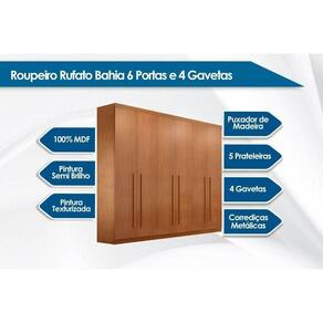 CARACTERÍSTICAS DE MÓVEIS Tipo de Estrutura do Móvel - 100% MDF Tipo de Pintura - Texturizada Tipo de Acabamento da Pintura - Semi Brilho Tipo de puxador - Madeira Quantidade de Prateleiras - 5 Prateleiras Quantidade de Gavetas - 4 Gavetas Diferenciais da Gaveta - c/ Corrediças Telescópicas - c/ Fundo Reforçado em Madeira Quantidade de Portas - 6 Portas de Abrir Garantia - 3 meses