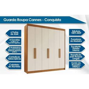 Tipo de Cabideiro - Aéreo Material dos Cabideiros - Cabideira Metálico Tipo de Porta do Guarda-Roupa - Portas de Bater Material das Portas - Portas em MDF Tipo de Dobradiças - Dobradiças Metálicas Quantidade de Portas - 6 Portas de Abrir Material das Gavetas - Gavetas em MDF Quantidade de Gavetas - 4 Gavetas Material das Prateleiras - Prateleiras em MDF Quantidade de Prateleiras - 5 Quantidade de Nichos - 2 Nichos