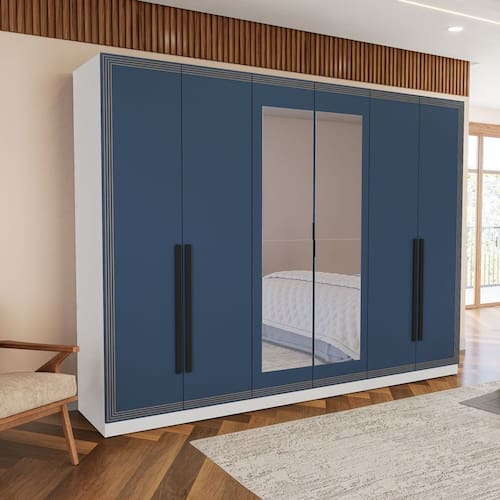 O guarda-roupa 6 portas 4 gavetas da linha Valência, da Politorno Móveis, é ideal para quem busca espaço, funcionalidade e elegância. Com 200 cm de altura, 242,1 cm de largura e 44,5 cm de profundidade, oferece amplo espaço para organizar roupas, calçados e acessórios. Fabricado em MDP/MDF com acabamento em pintura UV e FF, garante durabilidade. Seu design sofisticado é realçado pelos detalhes usinados e puxadores externos. As gavetas possuem corrediças telescópicas, proporcionando um deslizamento suave e preciso. O espelho agrega sofisticação e amplia o ambiente, tornando-o perfeito para quem deseja um móvel de alta qualidade no quarto. Acabamento da Prateleira: Pintura UV Escala de Brilho da Prateleira: Semi-Fosco Acabamento da Gaveta: Pintura UV Escala de Brilho da Gaveta: Semi-Fosco Material do Puxador da Gaveta: MDF Possui Organizador de Gaveta: Não Acabamento da Porta: Pintura UV Escala de Brilho da Porta: Semi-Fosco Material do Puxador da Porta: MDF Acabamento dos Pés: Finish Foil Altura do Espelho: 150 cm Altura dos Pés: 0,37 cm Altura Máxima dos Pés: 0.3700 Ambiente Principal: Quarto codigo_ean: 7900288113368 Complexidade da Montagem: Média: pode ser montado por mais de uma pessoa e/ou necessite de maior conhecimento para montagem Cor: Branco/Azul Cor do Produto: Branco/Azul Cor do Puxador: Preto Cor Interna: Branco Escala de Brilho: Semi-Fosco Espessura da Estrutura (mm): 15 mm Espessura das Portas (mm): 15 mm Espessura das Prateleiras (mm): 15 mm Espessura do Espelho: 3 mm Espessura do Fundo (mm): 3 mm Espessura do Fundo das Gavetas (mm): 3 mm Fita Integrada: Sim Formato do Espelho: Retangular Gaveta com Chave: Não Itens Inclusos: 1 Guarda-Roupa, Manual de Montagem e Kit Ferragens Largura do Espelho: 30 cm Linha ou Coleção: Valência Manual de Montagem e Instalação: https://product-hub-prd.madeiramadeira.com.br/984443/documents/6277440d-6632-4cc4-baf3-161e3d6fadc82806331622417440496620892.pdf Marca: Politorno Material da Gaveta: MDF/MDP Material da Porta: MDF/MDP Material da Prateleira: MDF/MDP Material dos Pés: MDF Material Principal: MDF/MDP modular: Não Necessita Montagem: Sim Origem do Produto: Nacional Peso: 127,02 kg Peso Máximo por Gaveta: 5 kg Peso Máximo por Prateleira: 10 kg Possui Calceiros: Não Possui Espelho: Sim Possui Pés: Rodapé Possui Portas: Sim Possui Prateleiras: Sim Produto Montado: Sim Quantidade de Espelho: 04 Espelhos com Tamanhos Iguais Quantidade de Gavetas: 04 Gavetas Quantidade de Portas com Espelhos: 2 Portas com Espelho Quantidade de Prateleiras: 04 Prateleiras Recomendações de Uso, Manutenção e Limpeza: Utilize um pano macio umedecido com água e sabão neutro, seguido de pano seco. Não utilize produtos químicos ou abrasivos para limpeza, pois estes danificam o revestimento do móvel. Sapatas Niveladoras: Não Sistema de Montagem: Cavilha, Parafuso, Minifix e Prego Tipo de Corrediça da Gaveta: Metálica Telescópica Tipo de Dobradiça/Corrediça da Porta: Alumínio Tipo de Fixação do Espelho: Fita Dupla Face Tipo de Gaveta: Interna Tipo de Guarda-Roupa: Casal Tipo de Puxador da Gaveta: Externo Tipo de Puxador da Porta: Externo undefined: 984451