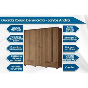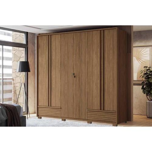 Tipo de Cabideiro - Aéreo Material dos Cabideiros - Cabideira Metálico Tipo de Porta do Guarda-Roupa - Portas de Bater Material das Portas - Portas em MDP Tipo de Dobradiças - Dobradiças Metálicas Diferenciais das Portas - Portas Ripadas Quantidade de Portas - 6 Portas de Abrir Material das Gavetas - Gavetas em MDP Tipo de Corrediça - c/ Corrediças Telescópicas Quantidade de Gavetas - 5 Material de Estrutura Fundo Gaveta - Em HDF Tipo dos Pés - Pés de Madeira Quantidade de Pés - 6 pés Material das Prateleiras - Prateleiras em MDP Quantidade de Prateleiras - 5 Quantidade de Nichos - 1 Nicho