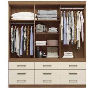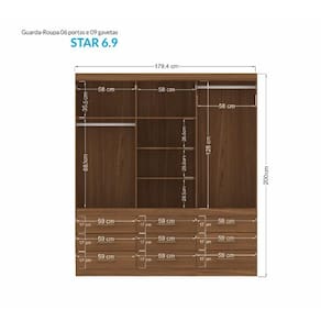 Guarda Roupa Star 6 Portas 9 Gavetas cor Jatobá / Areia O guarda roupa star 6 portas e 9 gavetas é um móvel que atende aos mais exigentes padrões dequalidade e de funcionalidade, pois suas 9 amplas gavetas garantem um super espaço para guardartudo que precisa. E em suas portas, cabideiros em alumínio e prateleiras complementam as ótimas características desse móvel. Os puxadores são em ABS na cor champagne. O acabamento é em pintura UV com aplicação de verniz brilho na cor off white e branco,tudo de acordo com as normas da ISO, respeitando o meio ambiente e buscando o desenvolvimento sustentável. Características:06 Portas com dobradiças metálicas04 Prateleiras02 Cabideiros/calceiros em alumínio09 Gavetas com corrediças metálicasAmplo maleiroPuxadores em ABS Altura: 205cmLargura: 179,4cmProfundidade: 46,3cm
