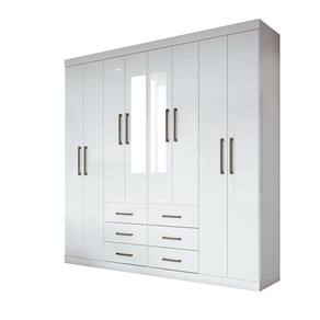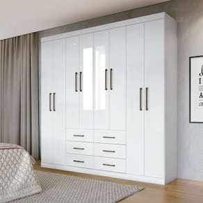 Características Estrutura: MDP 12mm e 15mm Acabamento: Pintura Quantidade e Tipo de Portas: 8 Tipo de Dobradiças/Trilhos: Dobradiças Metálicas Simples Quantidade de Gavetas: 6 Tipo de Corrediças: Telescópicas Tipo de Puxadores: Plástico ABS Quantidade e Tipo de Cabideiros: 3 em Alumínio Quantidade de Prateleiras: 5 Suporte até: 5kg na prateleira e 3kg por gaveta. Manutenção: Não limpar com álcool ou qualquer outro produto químico, utilize somente pano seco ou levemente umedecido. Sistema de Montagem: Cavilhas, Parafusos e Minifix Itens Inclusos: 1 Guarda Roupa, Kit ferragens e Manual de montagem Garantia de Fabrica: 3 meses
