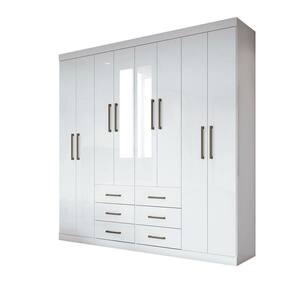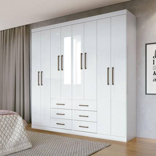 Guarda Roupa 8 Portas 6 Gavetas Com Espelhos Liverpool Santos Andirá Branco O Guarda Roupa Liverpool e um movel pratico e funcional, e se encaixa em qualquer ambiente do quarto de casal ou solteiro. Com 8 portas e 6 gavetas, esse roupeiro garante muito espaco para guardar todas as roupas. Puxadores em ABS garantem um design moderno. Internamente, possui amplas prateleiras para guardar todas as roupas de forma organizada, assim como edredons, cobertores, caixas, travesseiros, decoracao, etc. Possui 3 cabideiros em aluminio para pendurar todas as roupas (casacos, vestidos, camisas, blusas) com muita organizacao e seguranca. Um guarda roupa de casal completo e muito pratico para o seu quarto! Caracteristicas Estrutura: MDP 12mm e 15mm Acabamento: Pintura Quantidade e Tipo de Portas: 8 Tipo de Dobradicas/Trilhos: Dobradicas Metalicas Simples Quantidade de Gavetas: 6 Tipo de Corredicas: Telescopicas Tipo de Puxadores: Plastico ABS Quantidade e Tipo de Cabideiros: 3 em Aluminio Quantidade de Prateleiras: 5 Suporte ate: 5kg na prateleira e 3kg por gaveta. Manutencao: Nao limpar com alcool ou qualquer outro produto quimico, utilize somente pano seco ou levemente umedecido. Sistema de Montagem: Cavilhas, Parafusos e Minifix Itens Inclusos: 1 Guarda Roupa, Kit ferragens e Manual de montagem Garantia de Fabrica: 3 meses