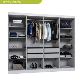 Com 8 portas de bater e amplo espaço interno, o modelo oferece excelente organização com gavetas internas, corrediças telescópicas, varão e calceiro em madeira. Sua modulação interna versátil permite acomodar desde roupas longas até acessórios, adaptando-se perfeitamente às suas necessidades.