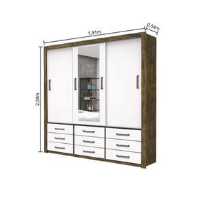 Guarda-Roupa Anjos Plus, com 3 portas de correr, sendo que em uma das portas possui espelho em toda sua extensão. Com 2,08m de altura, 1,91m de largura e 0,54m de profundidade, combinado com 9 gavetas, 4 prateleiras e 3 cabideiros, possibilitando ao consumidor acomodar todas as roupas de maneira organizada e com maior visibilidade. As roldanas em aço e o trilho em alumínio potencializam o deslizar das portas.