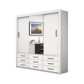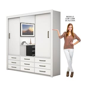 Guarda-Roupa Anjos Plus, com 3 portas de correr, sendo que em uma das portas possui espelho em toda sua extensão. Com 2,08m de altura, 1,91m de largura e 0,54m de profundidade, combinado com 9 gavetas, 4 prateleiras e 3 cabideiros, possibilitando ao consumidor acomodar todas as roupas de maneira organizada e com maior visibilidade. As roldanas em aço e o trilho em alumínio potencializam o deslizar das portas.