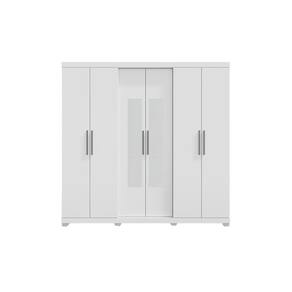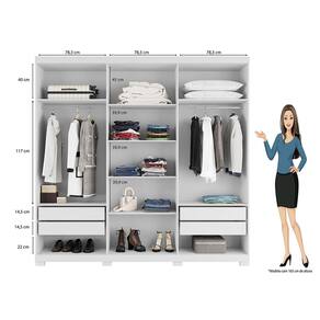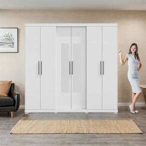Com 2,40 metros de altura e 2,34 metros de largura, esse guarda-roupa é perfeito para quem busca um móvel robusto e completo. Os puxadores cromados tipo Londres trazem um toque moderno, enquanto os oito pés plásticos na cor branca conferem leveza e facilitam a limpeza do ambiente.