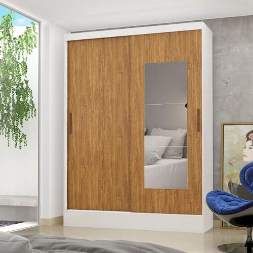 Com Puxador em Madeira, possui 3 prateleiras interna, 2 portas correr, 2 gavetas internas com corredicas metalicas alem de amplo espaco para os cabideiros.