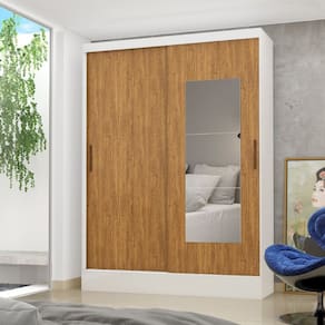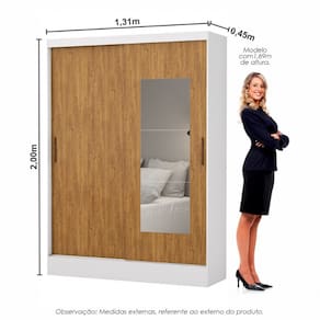 Com Puxador em Madeira, possui 3 prateleiras interna, 2 portas correr, 2 gavetas internas com corrediças metálicas além de amplo espaço para os cabideiros.