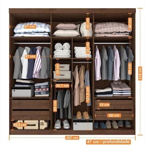 Os detalhes cuidadosamente pensados neste guarda roupa o tornam verdadeiramente especial. Seus puxadores alongados em MDF possuem um design moderno e funcional, enquanto suas portas contam com dobradiças robustas de 35 mm. Internamente, há cabideiros e calceiros metálicos, nichos centrais para acessórios, sapateiras e espaço para roupas longas. Além disso, as gavetas deslizam suavemente graças às corrediças telescópicas, proporcionando uma organização eficiente e acessível.