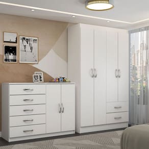 O(a) Guarda-Roupa Bella 4 Portas 2 Gavetas com Cômoda 2 Portas 5 Gavetas Branco - Loja é produzido em MDP na escala de brilho Fosco, e possui um grau de dificuldade de montagem: Médio.