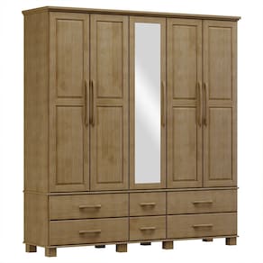 Características: Estrutura 100% em Madeira Maciça de Pinus Pintura Acetinada Verniz PU e UV Amplo espaço para armazenamento 06 Gavetas com Corrediças Telescópicas 05 Portas Dobradiças com amortecimento Porta Central Possue Espelho Cabideiro em alumínio Prateleiras Internas Puxadores e Pés em Madeira Maciça Peso Máximo Suportado pelas Gavetas 05kg Distribuídos Peso Máximo Suportado pelas Prateleiras 10kg Distribuídos Peso Máximo Suportado pelo Cabideiro 08kg Distribuídos Isolamento de Peças com Manta de Polietileno Expandido (Isomanta)