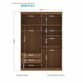 O guarda-roupa Buriti 04 portas é um guarda-roupa de casal de ótima qualidade, além do design diferenciado e atemporal que ele tem. São 4 portas, sendo 02 delas em MDF e com detalhe usinado ripado e puxadores pontuais em ABS para abertura. As demais portas em MDP seguem com puxadores em MDF revestido em formato grande. Internamente, possui 05 amplas prateleiras com muito espaço para guardar os pertences, 02 cabideiros oblongos em aluminio de excelente qualidade para pendurar as roupas, 02 gavetas com corrediças telescópicas que suportam muito mais peso, compartimento para guardar pertences de valor. Externamente, o acabamento é em textura Reverse semi-fosco, suave ao toque, e que facilita a limpeza. Todo o processo fabril está certificado na Iso 9001, excelência na qualidade dos processos. Acabamento da Prateleira: Pintura Escala de Brilho da Prateleira: Semi-Fosco Possui Cabideiros: 01 Acabamento da Gaveta: Pintura Escala de Brilho da Gaveta: Semi-Fosco Material do Puxador da Gaveta: MDP Possui Organizador de Gaveta: Não Acabamento da Porta: Pintura Escala de Brilho da Porta: Semi-Fosco Material do Puxador da Porta: MDF Ambiente Principal: Quarto codigo_ean: 7909903364437 Complexidade da Montagem: Média: pode ser montado por mais de uma pessoa e/ou necessite de maior conhecimento para montagem Cor: Jatobá/Jatobá Cor do Produto: Jatobá/Jatobá Cor Flex: Não Cor Interna: Jatobá Escala de Brilho: Semi-Fosco Gaveta com Chave: Não Itens Inclusos: 1 Guarda roupa, 1 Kit Ferragens, 1 Manual de Montagem Linha ou Coleção: Buriti Manual de Montagem e Instalação: https://product-hub-prd.madeiramadeira.com.br/861007/documents/148663c9-ae0f-4ea3-a045-febab8cbb7bb1420703949316grburiti04pts.pdf Material da Gaveta: MDP Material da Porta: MDF/MDP Material da Prateleira: MDP Material Principal: MDP modular: Não Montagem Flex: Não Necessita Montagem: Sim Origem do Produto: Nacional Peso: 97,95 kg Peso Máximo por Gaveta: 3 kg Peso Máximo por Prateleira: 3 kg Possui Calceiros: 01 Possui Espaço para Vestidos Longos: Não Possui Espelho: Não Possui Espelho Interno: Não Possui Ganchos: Não Possui iluminação: Não Possui Nichos: Não Possui Painel de TV: Não Possui Pés: Não Possui Portas: Sim Possui Prateleiras: Sim Possui Sapateira: Não Produto Montado: Sim Quantidade de Gavetas: 02 Gavetas Quantidade de Prateleiras: 05 Prateleiras Recomendações de Uso, Manutenção e Limpeza: Pano Levemente Umedecido e Flanela Sistema de Montagem: Parafusos e Cavilhas. Tipo de Corrediça da Gaveta: Metálica Telescópica Tipo de Dobradiça/Corrediça da Porta: Metálica Tipo de Gaveta: Interna Tipo de Guarda-Roupa: Casal Tipo de Puxador da Gaveta: Não Possui Tipo de Puxador da Porta: Externo