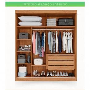 É um móvel conceitual e impressiona pelo seu acabamento e tamanho, pelos espaços bem distribuídos e os detalhes pensados para atender as mais variadas necessidades do usuário, são eles: puxadores metálicos moderno e funcional, cabideiros e calceiro metálicos, nichos central para acessórios, sapateiras e espaço para longos, gavetas com corrediças telescópicas, para acomodar os seus pertences e proporcionar a melhor organização do espaço.