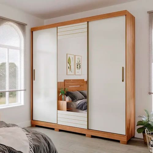 Deixe seu quarto bonito e elegante com Guarda Roupa Búzios Panan Móveis. Com portas deslizantes, tornando o muito mais prático e facilitando seu dia a dia. O roupeiro conta ainda, com espelho na porta central. O Roupeiro Búzios, foi produzido pensando em te garantir a melhor qualidade, com estrutura 100 em MDF, possui 3 portas com puxadores em Alumínio Bronze, 4 gavetas internas com corrediças telescópicas. E conta ainda, com prateleiras com muito espaço, para você organizar suas peças da melhor forma.