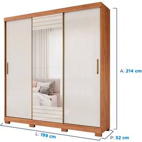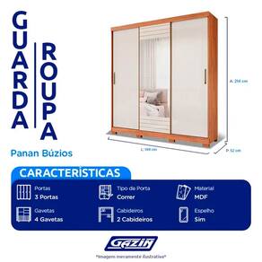 Características: Marca: Panan Modelo: Búzios Tipo: Roupeiro Tipo de porta: Correr Quantidade de portas: 3 portas Quantidade de gavetas: 4 Gavetas Quantidade de cabideiros: 2 Sapateira: Não Espelho: Sim Gaveta com chave: Não Material do trilho: Alumínio Bronze Tipo de corrediças: Telescópicas Material da estrutura: MDF Material das portas: MDF Material das gavetas: MDF Material dos puxadores: Alumínio Bronze Pés: Sim Material dos pés: ABS Acabamento: Pintura UV Sistema de montagem: Minefix, parafusos e cavilhas