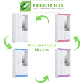 Este produto na cor Branca é Flex, ou seja, vem com rodapés e molduras bicolores nas cores branco/rosa/azul/lilás para que o cliente escolha no ato da montagem a combinação de cor desejada. São 4 opções de cores no mesmo produto!