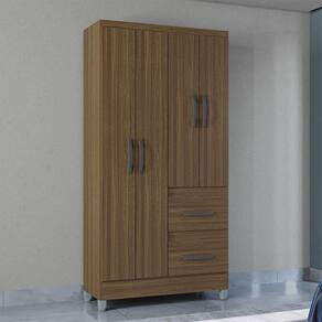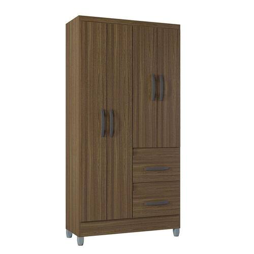 Estrutura: Fabricado em MDP 15 mm, um material resistente que garante a durabilidade do movel. Portas: 04 portas com dobradicas metalicas para garantir robustez e maior resistencia ao uso continuo. Gavetas: 02 gavetas com corredicas plasticas, proporcionando um deslize suave e durabilidade para armazenamento de itens pessoais. Cabideiro: Equipado com cabideiro, ideal para pendurar roupas e manter sua organizacao em ordem. Pes: Pes de plastico que oferecem estabilidade e resistencia, alem de nao danificarem o piso. Puxadores: Puxadores de plastico com design funcional e moderno, garantindo praticidade no uso diario.