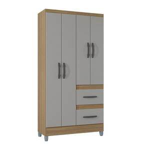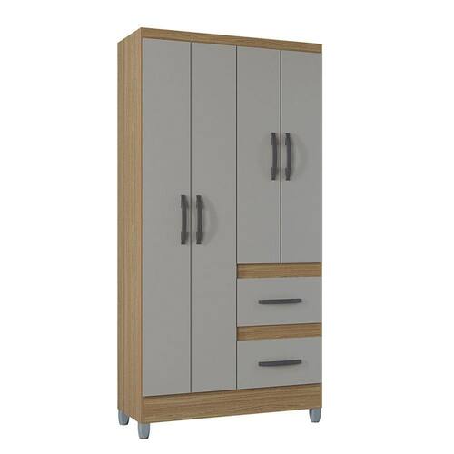 Estrutura: Fabricado em MDP 15 mm, um material resistente que garante a durabilidade do movel. Portas: 04 portas com dobradicas metalicas para garantir robustez e maior resistencia ao uso continuo. Gavetas: 02 gavetas com corredicas plasticas, proporcionando um deslize suave e durabilidade para armazenamento de itens pessoais. Cabideiro: Equipado com cabideiro, ideal para pendurar roupas e manter sua organizacao em ordem. Pes: Pes de plastico que oferecem estabilidade e resistencia, alem de nao danificarem o piso. Puxadores: Puxadores de plastico com design funcional e moderno, garantindo praticidade no uso diario.