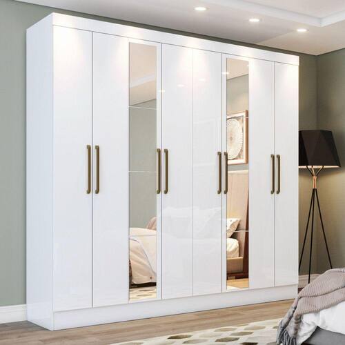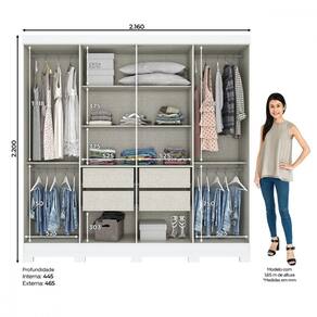 FICHA TÉCNICA ROUPEIRO: Acabamento: Pintura UV Cor Interna: Na versão Branco o interno é Trama Branco e na versão Preto é Trama Escala de Brilho: Na versão Branco é Brilho e na versão Preto é Fosco Material do Fundo: MDF Possui Espaço para Vestidos Longos: Sim Possui Ganchos: Não Possui Iluminação Led: Não Possui Maleiro: Não Possui porta Objetos: Não Qtd. Portas: 8 Und. Tipo Porta: Bater Material da Porta: MDP Material da Dobradiça: Metálica Material do Puxador Porta: ABS Qtd. Gavetas: 4 Und. Material da Gaveta: MDP Material da Corrediça: Metálica Material do Puxador Gaveta: Não Possui, fechamento através da própria gaveta Peso Máximo por Gaveta: 3 KGs Possui Organizador de Gaveta: Não Qtd. Prateleiras: 3 Und. Material da Prateleira: MDP Peso Máximo por Prateleira: 8 KGs Possui pés: 10 Und. Material dos Pés: ABS Altura Pés/Rodapés: 5 Cm Pés Reguláveis: Não Possui Espelho: Sim Quantidade de Espelhos: 8 Und Medida de Cada Espelho -A x L-: 46,5 x 21,5 Cm Possui Vidro: Não Material do Cabideiro: Madeira Material do Calceiro: Madeira Produto Suporta até -Kg-: 76 Kg Material Principal: MDP Medidas Montado: 220 x 216 x 46,5 Cm Peso Montado: 124 Kg