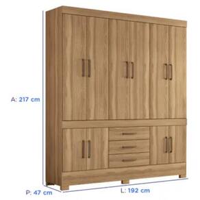 Com 10 portas e 03 gavetas, o guarda-roupa proporciona amplos compartimentos para roupas, calçados e acessórios, garantindo que cada item tenha seu devido lugar. As portas de giro, equipadas com dobradiças metálicas, garantem durabilidade e resistência, proporcionando um fechamento suave e eficiente. As gavetas externas, por sua vez, são equipadas com corrediças metálicas, oferecendo mais agilidade no uso diário e maior capacidade de armazenamento para itens menores, como roupas íntimas, acessórios e objetos pessoais.