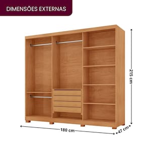 O guarda-roupa Chile 3 portas de correr em 100 MDF é a escolha perfeita para quem busca qualidade e praticidade. Fabricado com MDF, um material que oferece excelente durabilidade e resistência, ele garante um acabamento refinado. Com 6 prateleiras e 3 cabideiros, proporciona amplo espaço para organizar roupas e acessórios de forma eficiente. Seu design inteligente economiza espaço, tornando-o uma excelente opção para ambientes modernos. Acabamento da Prateleira: Pintura Texturizada UV Escala de Brilho da Prateleira: Semi-Brilho Possui Cabideiros: Sim Acabamento da Gaveta: Pintura Texturizada UV Escala de Brilho da Gaveta: Semi-Brilho Possui Organizador de Gaveta: Não Acabamento da Porta: Pintura UV Escala de Brilho da Porta: Semi-Brilho Altura do Espelho: 60 cm Altura dos Pés: 7 cm Altura Máxima dos Pés: 7.0000 Ambiente Principal: Quarto codigo_ean: 7900288219299 Complexidade da Montagem: Média: pode ser montado por mais de uma pessoa e/ou necessite de maior conhecimento para montagem Cor: NATURALLE / OFF WHITE Cor da Porta: Off White Cor do Produto: NATURALLE / OFF WHITE Cor Flex: Não Cor Interna: Naturalle Escala de Brilho: Semi-Brilho Espessura da Estrutura (mm): 12 mm Espessura das Portas (mm): 15 mm Espessura das Prateleiras (mm): 12 mm Espessura do Espelho: 3 mm Espessura do Fundo (mm): 2,5 mm Espessura do Fundo das Gavetas (mm): 2,5 mm Formato do Espelho: Retangular Gaveta com Chave: Não Itens Inclusos: 1 Guarda-Roupa, Kit Ferragens e Manual de Montagem Largura do Espelho: 63,4 cm Linha ou Coleção: Chile Manual de Montagem e Instalação: https://product-hub-prd.madeiramadeira.com.br/373549427/documents/8e122486-9545-4517-8a67-63b1a2175f0a3164450584417563133001294.pdf Marca: Rufato Material da Gaveta: MDF Material da Porta: MDF Material da Prateleira: MDF Material dos Pés: Plástico Material Principal: MDF modular: Não Montagem Flex: Não Necessita Montagem: Sim Nicho com Cabideiro: Sim Origem do Produto: Nacional Peso: 119,26 kg Peso Máximo por Gaveta: 4 kg Peso Máximo por Prateleira: 6 kg Porta Janelada: Não Possui Calceiros: 01 Possui Capelinha: Não Possui Espelho: Sim Possui Espelho Interno: Não Possui Ganchos: Não Possui iluminação: Não Possui Nichos: Sim Possui Painel de TV: Não Possui Penteadeira: Não Possui Pés: 08 Possui Portas: Sim Possui Prateleiras: Sim Produto Montado: Sim Quantidade de Cabideiros: 02 Cabideiros Quantidade de Espelho: 03 Espelhos com Tamanhos Iguais Quantidade de Gavetas: 04 Gavetas Quantidade de Portas com Espelhos: 1 Porta com Espelho Quantidade de Prateleiras: 06 Prateleiras Recomendações de Uso, Manutenção e Limpeza: Limpar com pano seco. Sapatas Niveladoras: Não Sistema de Montagem: Parafusos e Cavilhas Tipo de Corrediça da Gaveta: Metálica Telescópica Tipo de Dobradiça/Corrediça da Porta: Metálica Tipo de Fixação do Espelho: Parafusos Tipo de Gaveta: Interna Tipo de Guarda-Roupa: Casal Tipo de Puxador da Gaveta: Não Possui Tipo de Puxador da Porta: Externo