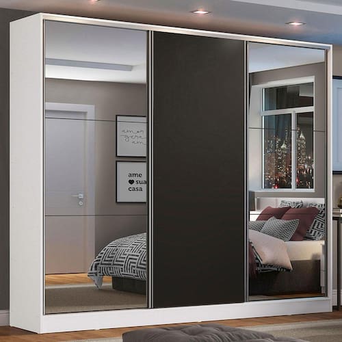 Itens inclusos: - Quatro (4) gavetas internas - Oito (8) prateleiras - Três (3) cabideiros - Três (3) portas de correr com sistema anti-descarrilhamento, sendo duas (2) com espelhos e uma (1) de madeira