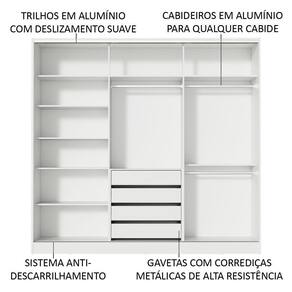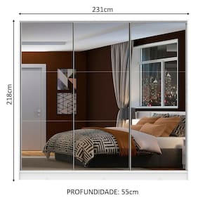 - Itens inclusos: Quatro (4) gavetas internas | Oito (8) prateleiras | Três (3) cabideiros | Três (3) portas de correr com espelhos e sistema anti-descarrilhamento