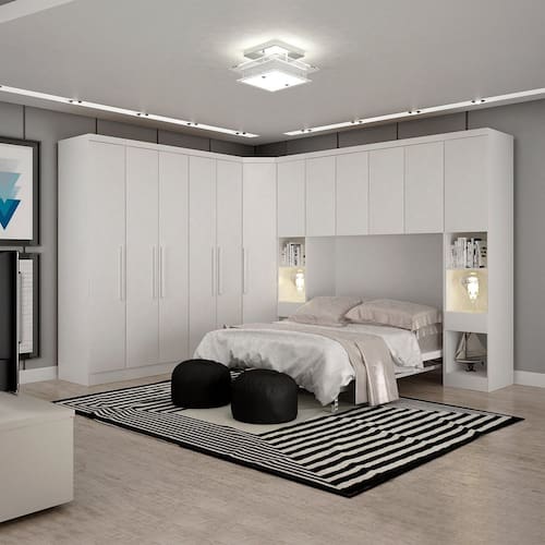 "Guarda roupa casal modulado 100% mdf, puxadores com acabamento amadeirado, dobradiças de pressão 35cm, 6 gavetas internas com puxadores e corrediças telescópicas, espaço para longo, cabideiros e calceiros em alumínio. Transforme o seu quarto com o guarda-roupa modulado perfeito para quem busca organização sem abrir mao do design moderno e sofisticado. Ideal para casais que querem otimizar espaço com estilo de móveis planejados." Acabamento da Prateleira: Pintura Texturizada UV Escala de Brilho da Prateleira: Semi-Brilho Possui Cabideiros: Sim Acabamento da Gaveta: Pintura Texturizada UV Escala de Brilho da Gaveta: Semi-Brilho Material do Puxador da Gaveta: ABS Possui Organizador de Gaveta: Não Acabamento da Porta: Pintura Texturizada UV Escala de Brilho da Porta: Semi-Brilho Material do Puxador da Porta: MDF Ambiente Principal: Quarto codigo_ean: 7900288238900 Complexidade da Montagem: Alta: deve ser montado por um montador especializado Cor: Neve Cor da Porta: Branco Cor do Produto: Neve Cor do Puxador: Branco Cor Interna: Neve Escala de Brilho: Semi-Brilho Espessura da Estrutura (mm): 12 mm Espessura das Portas (mm): 15 mm Espessura das Prateleiras (mm): 15 mm Espessura do Fundo (mm): 3 mm Espessura do Fundo das Gavetas (mm): 3 mm Gaveta com Chave: Não Itens Inclusos: 1 Guarda-Roupa, Kit Ferragens e Manual de Montagem Linha ou Coleção: Cairo Manual de Montagem e Instalação: https://product-hub-prd.madeiramadeira.com.br/288015208/documents/21b4b1fe-6152-498d-8529-ae0ceebb78322944712646117479198620089.pdf Marca: Novo Horizonte Material da Gaveta: MDF Material da Porta: MDF Material da Prateleira: MDF Material Principal: MDF modular: Sim Montagem Flex: Não Necessita Montagem: Sim Nicho com Cabideiro: Sim O Módulo Pode ser utilizado individualmente: Sim Origem do Produto: Nacional Peso: 470 kg Peso Máximo por Gaveta: 5 kg Peso Máximo por Prateleira: 10 kg Porta Janelada: Não Possui Calceiros: 02 Possui Espelho: Não Possui Pés: Não Possui Portas: Sim Possui Prateleiras: Sim Produto Montado: Sim Quantidade de Cabideiros: 03 Cabideiros Quantidade de Gavetas: 08 Gavetas Quantidade de Prateleiras: 15 Prateleiras Recomendações de Uso, Manutenção e Limpeza: Limpar com flanela ou pano macio seco, não utilizar produtos abrasivos, desengordurantes, álcool ou solventes. Não expor produto diretamente à luz solar e à umidade. Sistema de Montagem: Parafusos, Cavilhas e outros Tipo de Corrediça da Gaveta: Metálica Telescópica Tipo de Dobradiça/Corrediça da Porta: Metálica Tipo de Gaveta: Interna Tipo de Guarda-Roupa: Casal Tipo de Puxador da Gaveta: Externo Tipo de Puxador da Porta: Externo
