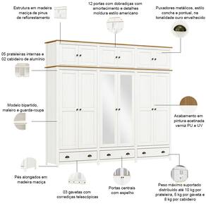 O espelho integrado transforma o ritual matinal em um momento de charme, enquanto o maleiro espaçoso acomoda até aqueles cobertores de inverno que nunca sabemos onde guardar. Cada detalhe foi pensado para a vida a dois, desde prateleiras amplas, cabideiros estratégicos até detalhes dos puxadores concha e moldura nas portas, estilo americano. Mais que um roupeiro grande, um compartimento de histórias - onde cada porta abre espaço não só para roupas, mas para memórias bem guardadas.