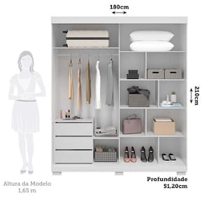 O Guarda-roupa Freesia é a solução perfeita para quem busca um móvel elegante e funcional para o quarto. O acabamento em pintura UV proporciona um toque de sofisticação, enquanto as gavetas deslizam suavemente graças às corrediças telescópicas. Com design moderno e sofisticado, ele se destaca pelo painel ripado e pelas portas de correr, que otimizam o espaço e facilitam o uso no dia a dia. Acabamento da Prateleira: Pintura UV Escala de Brilho da Prateleira: Semi-Brilho Possui Cabideiros: Sim Acabamento da Gaveta: Pintura UV Escala de Brilho da Gaveta: Semi-Brilho Possui Organizador de Gaveta: Não Acabamento da Porta: Pintura UV Escala de Brilho da Porta: Semi-Brilho Altura dos Pés: 5 cm Ambiente Principal: Quarto codigo_ean: 7900288069627 Complexidade da Montagem: Alta: deve ser montado por um montador especializado Cor: Branco Cor da Porta: Branco Cor do Produto: Branco Cor Interna: Linho Escala de Brilho: Semi-Brilho Espessura da Estrutura (mm): 12 mm Espessura das Portas (mm): 15 mm Espessura das Prateleiras (mm): 12 mm Espessura do Fundo (mm): 2,5 mm Espessura do Fundo das Gavetas (mm): 2,5 mm Gaveta com Chave: Não Guarda-Roupa Suporta Até (kg): 90 kg Informações Complementares: Portas de correr com trilho superior em MDF e inferior em alumínio, facilitando a movimentação. Itens Inclusos: 1 Guarda-Roupa + Kit Ferragens + Manual de Montagem Linha ou Coleção: Freesia Manual de Montagem e Instalação: https://cdn2.madeiramadeira.com.br/prd/acp-moveis/2692979-1739804022-978394-149314.pdf Marca: Espresso Móveis Material da Gaveta: MDF Material da Porta: MDF Material da Prateleira: MDF Material dos Pés: Plástico Material Principal: MDP modular: Não Necessita Montagem: Sim Nicho com Cabideiro: Não Origem do Produto: Nacional Peso: 133 kg Peso Máximo por Gaveta: 5 kg Peso Máximo por Prateleira: 5 kg Porta Janelada: Não Possui Calceiros: Não Possui Capelinha: Não Possui Espaço para Vestidos Longos: Não Possui Espelho: Não Possui Espelho Interno: Não Possui Ganchos: Não Possui iluminação: Não Possui Painel de TV: Não Possui Penteadeira: Não Possui Pés: 06 Possui Portas: Sim Possui Prateleiras: Sim Quantidade de Cabideiros: 01 Cabideiro Quantidade de Gavetas: 03 Gavetas Quantidade de Prateleiras: 06 Prateleiras Recomendações de Uso, Manutenção e Limpeza: Para limpar não use nenhum tipo de produto, tais como sabão, esponja de aço, álcool e lustra-móveis. Use somente uma flanela seca. Não molhe nem exponha o móvel à umidade ou a luz solar diretamente ou outra forma de calor. Não encoste o móvel na parede. Não o arreste. Se precisar mudar o móvel de lugar, esvazie por completo o móvel, não o arraste, com ajuda de outras pessoas suspenda o móvel de forma segura e o posicione no lugar desejado. Sapatas Niveladoras: Não Sistema de Montagem: Parafusos, Cantoneiras e Minifix Suporta Até (kg): 90 kg Tipo de Corrediça da Gaveta: Metálica Telescópica Tipo de Dobradiça/Corrediça da Porta: Alumínio Tipo de Gaveta: Interna Tipo de Guarda-Roupa: Casal Tipo de Puxador da Gaveta: Não Possui Tipo de Puxador da Porta: Não Possui
